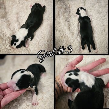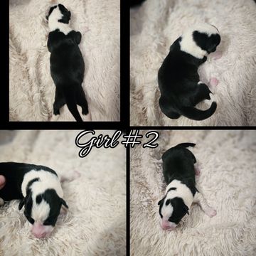 This is such a stunning black and white girl! Look at those markings!! Sure to be a show stopper just like his mom and dad!